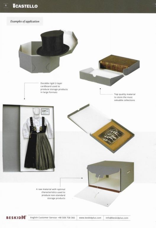 Cartón de primera calidad fabricado con celulosa 100 % pura. Cartón sólido de doble capa , gris oscuro con interior blanco. Se utiliza para fabricar productos de almacenamiento- Certificados ISO 16245 tipo A y PAT- 100% celulosa- color: gris oscuro con interior blanco- pH > 7,5- reserva alcalina > 0,4 ??mol/kg- Número Kappa < 5- absorbencia de agua : Cobb 60 < 25 g/m 2- sin migración de colorantes- sin blanqueadores ópticos- gramajes : 600, 800, 1100 y 1400 g/m 2